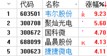 在112家半导体公司中,43家公司市值上涨,其中韦尔股份、聚灿光电、国科微、晶晨股份、捷捷微电涨幅居前;69家公司市值下跌,晓程科技、振芯科技、宏达电子、国民技术、富瀚微跌幅居前。