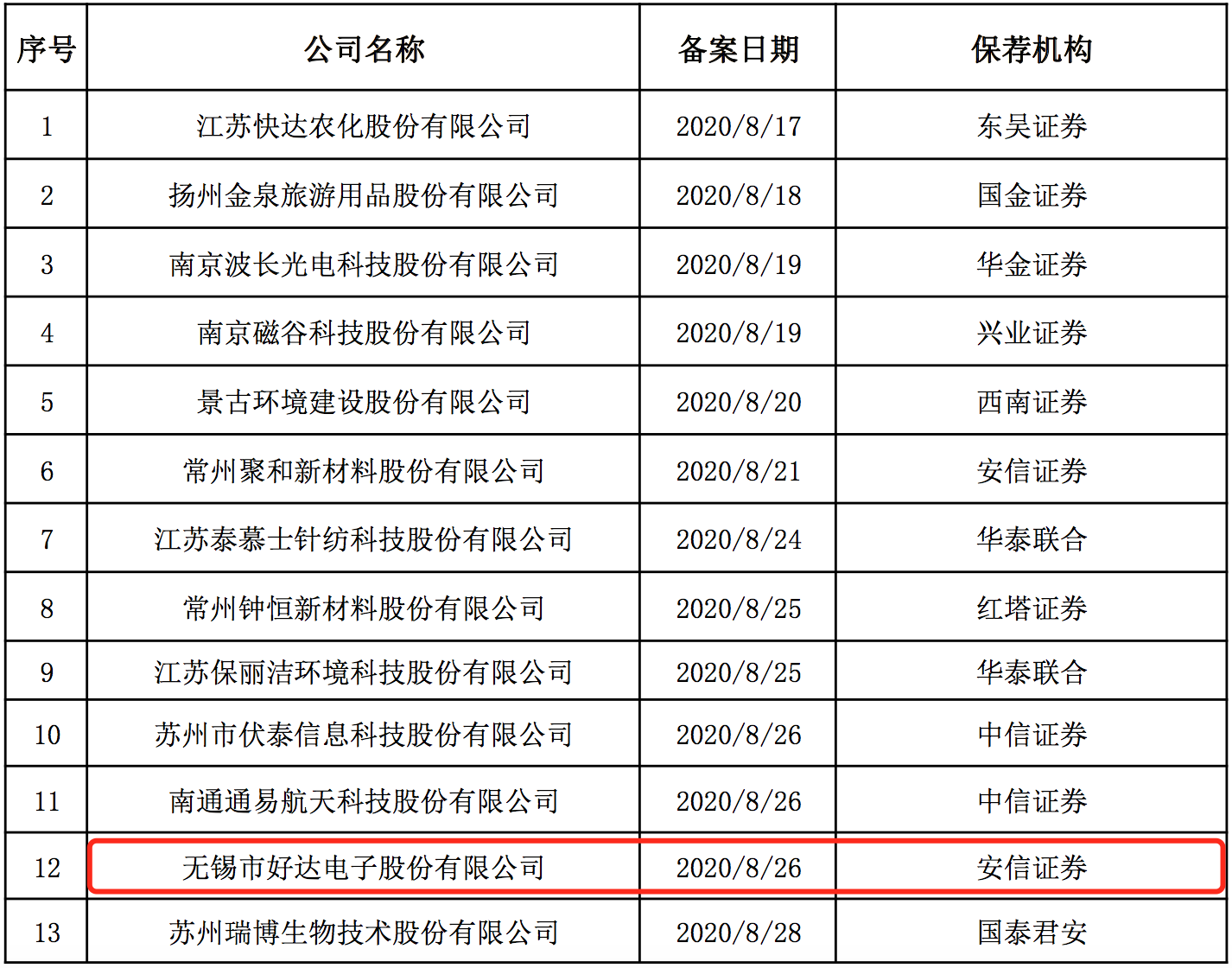 集微网消息,9月2日,江苏监管局披露了相关企业辅导备案信息公示表。其中,无锡市好达电子股份有限公司(简称“好达电子”)已于8月26日进行辅导备案登记,辅导机构为安信证券。