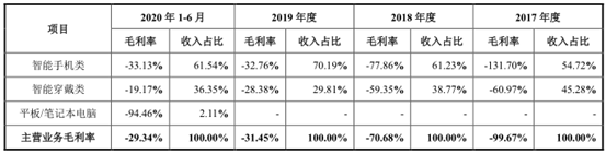 其中,报告期内,智能手机类AMOLED半导体显示面板产品毛利率分别为-131.70%、-77.86%、-32.76%和-33.13%,智能穿戴类AMOLED半导体显示面板产品毛利率分别为-60.97%、-59.35%、-28.38%和-19.17%。而在平板/笔记本电脑领域,今年上半年其毛利率为-94.46%。可见,和辉光电的毛利率仍处于较低的水平。