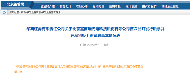 集微网消息 9月3日,北京监管局披露了华英证券有限责任公司(以下简称“华英证券”)关于北京富吉瑞光电科技股份有限公司(以下简称“富吉瑞”)于首次公开发行股票并在科创板上市辅导基本情况。
