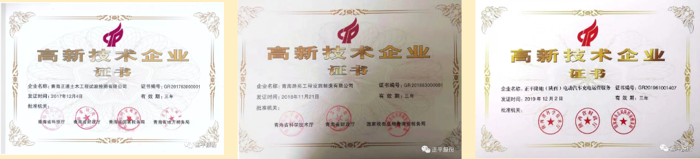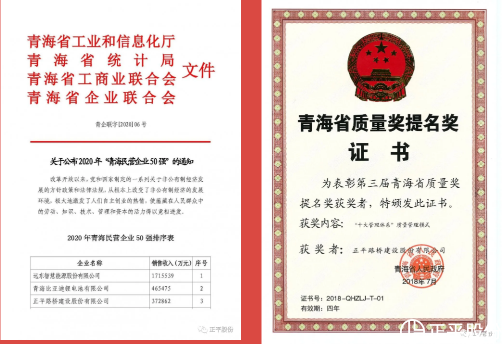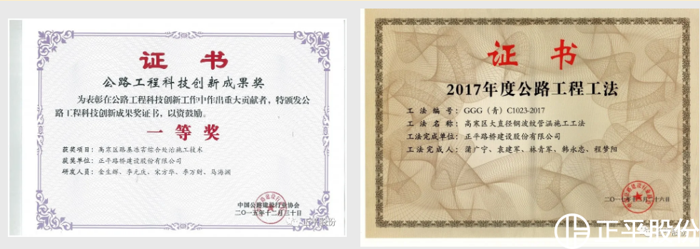 品牌建设成就不凡。公司被评为公路建设行业科技创新领军企业并被认定为科技型企业,下属三家公司被认定为高新技术企业,“路拓制造”牌金属波纹涵管(Φ0.75-Φ8)被评定为“青海名牌”,正平管廊“钢制螺旋波纹管排水管道及抱箍式连接管件”入选《青海省建设领域先进适用技术与产品名录》。正平隆地充电运营公司被评为最具成长性充电桩运营商和优秀雏鹰企业。
