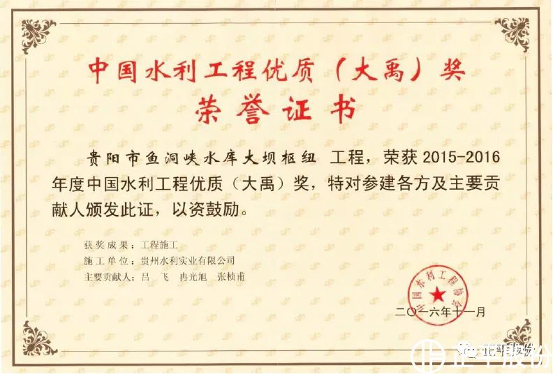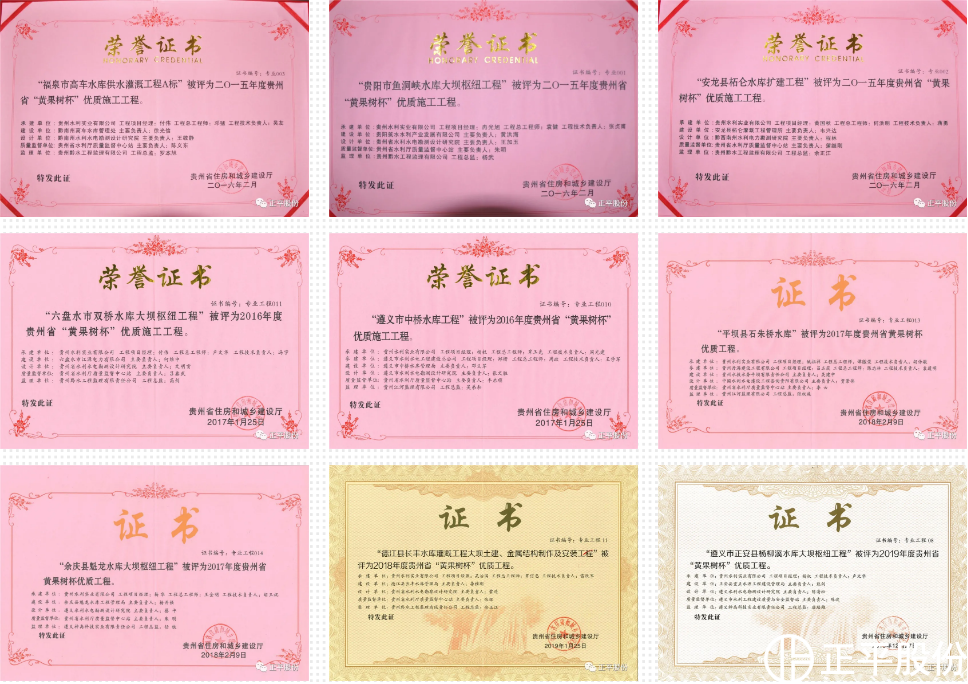 水利建设捷报频传。参与并完成了贵阳市水资源综合开发和水土保持工程的标志性核心项目——鱼洞峡水库,贵州省第一座在软基覆盖层基础上建坝的中型水利枢纽工程——德江县长丰水库,贵州省“三位一体”规划建设的骨干水源工程之一——余庆县魁龙水库,以及多个中型水库工程的建设任务,其中有1项工程荣获中国水利工程优质(大禹)奖,9项工程荣获贵州省“黄果树杯”优质工程奖。