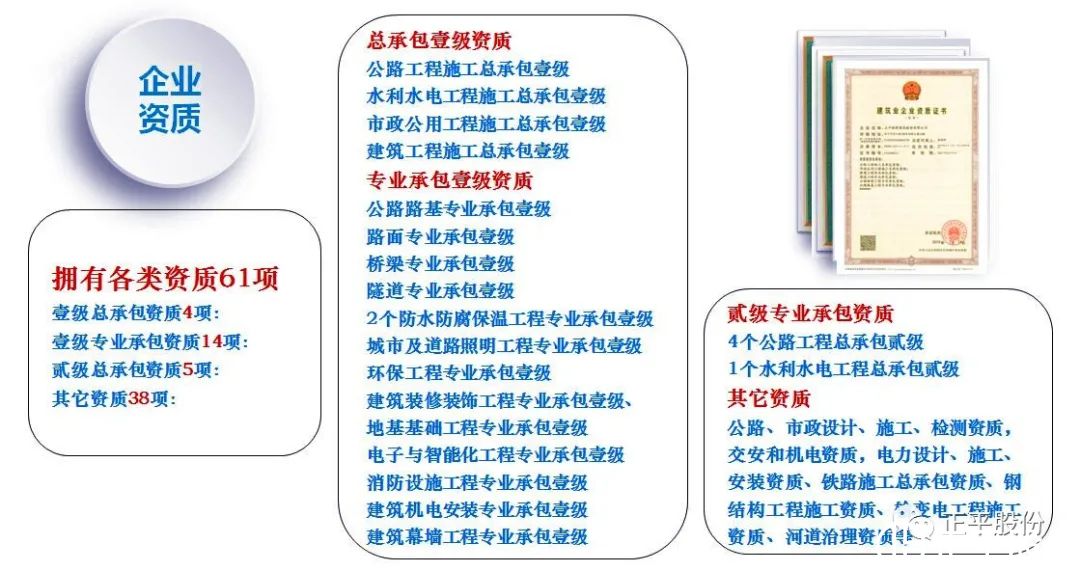 实现了业务资质的突破,九年来累计新增壹级资质13项、贰级资质14项、叁级资质6项和乙级资质4项,截止目前,正平股份拥有各类资质共计61项,主要包括公路、市政、水利水电、建筑4项施工总承包壹级资质,14项专业承包壹级资质、5项贰级总承包资质和43项其他资质,基本涵盖了交通、城镇、水利、电力等基础设施全领域。