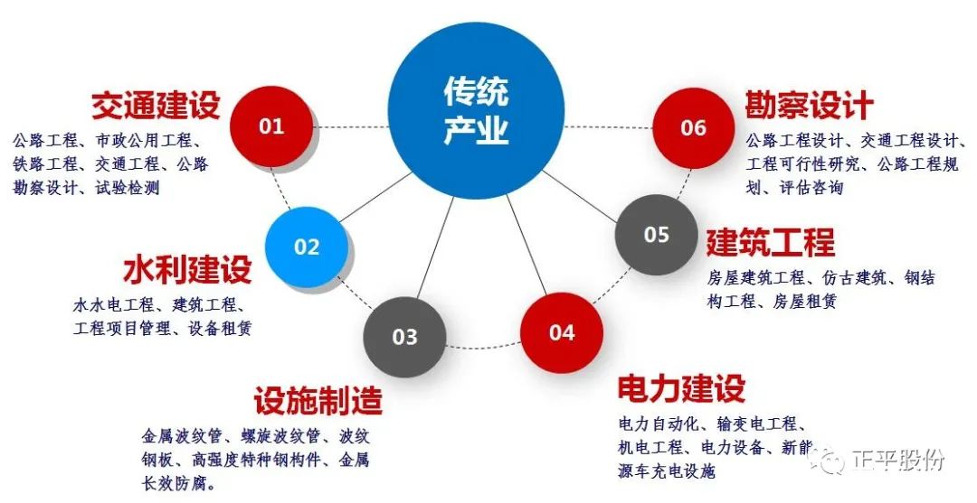 在业务范围上,完成了从传统的施工业务向基础设施全产业链领域的转型,即由交通建设、水利建设、电力建设、设施制造、建筑工程、勘察设计等传统产业,逐步拓展了项目投资、文旅开发与运营、城镇综合项目开发与运营、公路养护与运维、环保材料制造及建筑垃圾处理、新能源汽车充电桩的建设与运营、矿业开发等新兴产业。