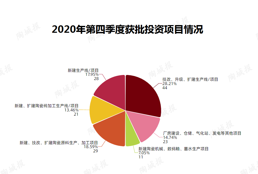 据不完全统计,2020年第四季度,全国各地审批通过156个陶瓷相关投资项目,相比2020年第三季度减少了45个。