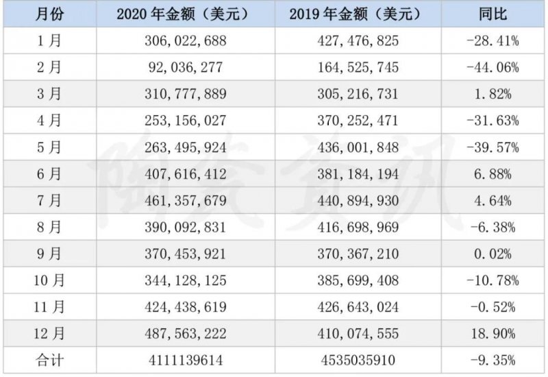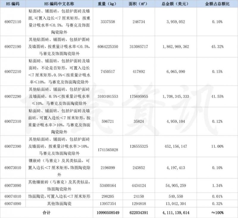 陶瓷资讯根据海关统计数据分析,2020年1-12月,我国陶瓷砖出口41.11亿美元(折合人民币265.56亿元),相比2019年同期的45.35亿美元,下滑9.35%;出口量6.22亿㎡,陶瓷砖出口平均单价为0.374美元/㎏(折合人民币2.42元/kg)及6.609美元/㎡(折合人民币42.70元/㎡)。
