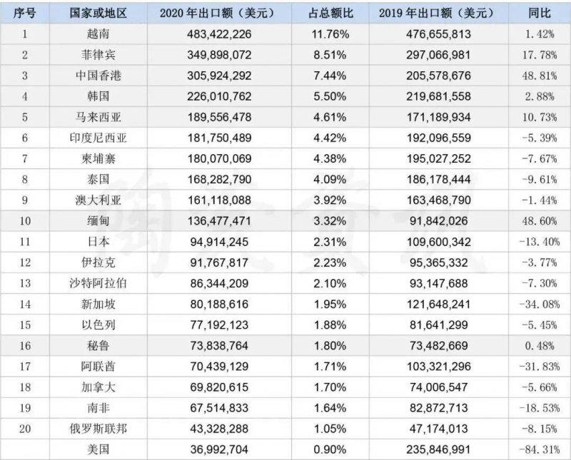 美国市场的变化则较为明显,从2017年至2020年,美国市场在中国陶瓷砖出口的占比在不断发生变化,分别为8.38%、9.49、5.20%,0.90%。