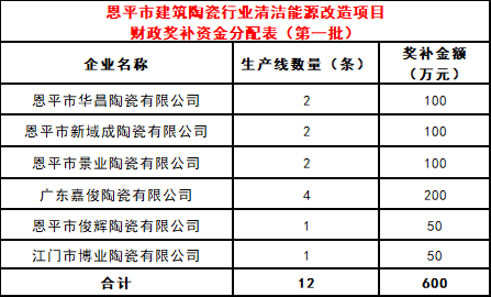 近日,江门市人民政府发布《关于恩平市建筑陶瓷行业清洁能源改造项目财政奖补资金分配方案(第一批)的公示》,6家陶企12条生产线共获得奖补600万元。