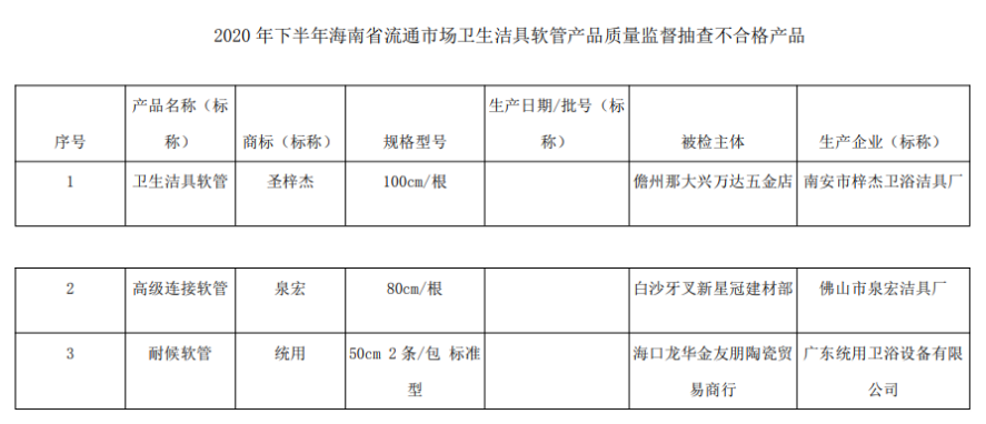 1月15日,海南省市场监督管理局网站公布2020年下半年海南省流通市场卫生洁具软管产品质量监督抽查结果。10批次卫生洁具软管产品不合格3批次,不合格发现率为30%,涉及的不合格项目为尺寸。不合格产品名单如下: