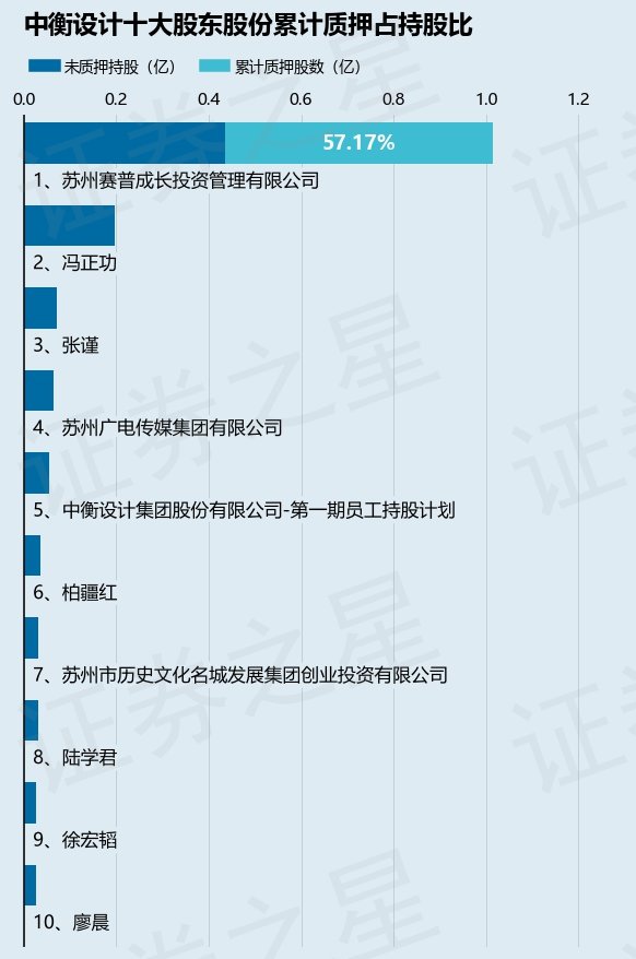 截止本公告日,股东苏州赛普成长投资管理有限公司已累计质押股份5800.0万股,占其持股总数的57.17%。本次质押后中衡设计(603017)十大股东的累计质押股份占持股比例见下图: