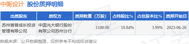 中衡设计(603017)6月28日公开信息显示,股东苏州赛普成长投资管理有限公司向中国光大银行(601818)股份有限公司苏州分行合计质押1100.0万股,占总股本3.99%。质押详情见下表: