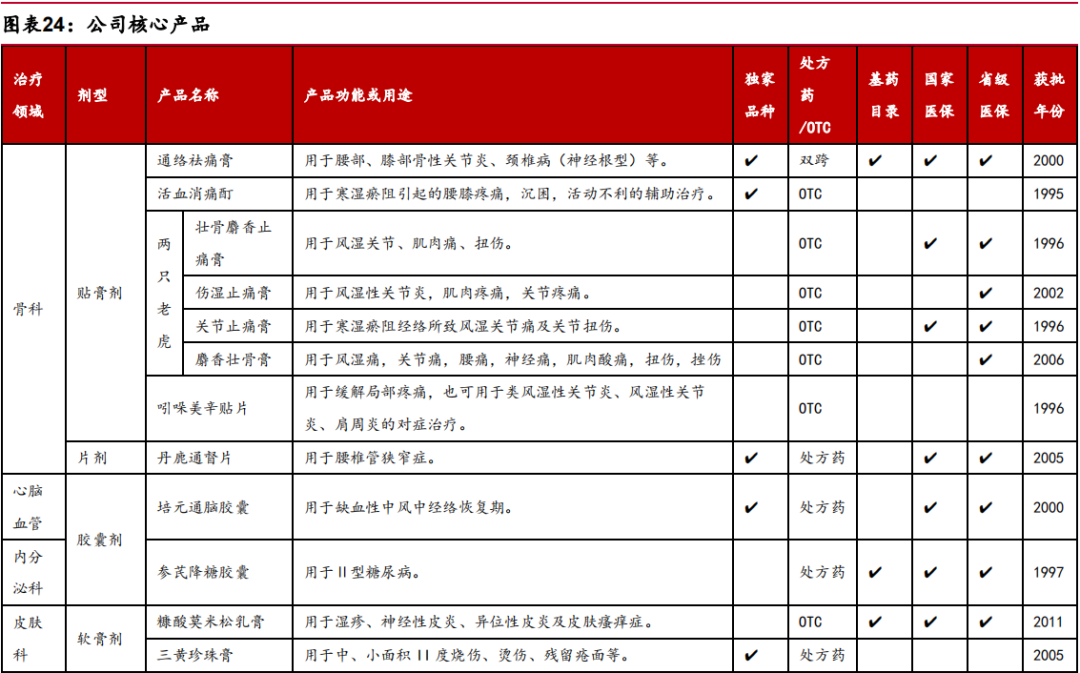 产品矩阵丰富。公司拥有百余种产品,分为贴剂、胶囊剂、片剂、软膏剂等多种剂型,涵盖骨科、心脑血管科、内分泌科、皮肤科、儿科、麻醉科等领域。其中骨科主要产品为通络祛痛膏、两只老虎、活血消痛酊、丹鹿通督片;心脑血管科主要为培元通脑胶囊;内分泌科主要为参芪降糖胶囊;皮肤科主要为糠酸莫米松乳膏;儿科主要为医用退热贴和舒腹贴膏;麻醉科主要为芬太尼透皮贴剂。