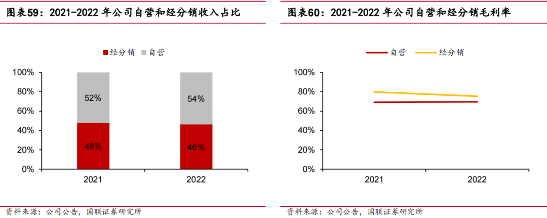 2022年自营和经分销收入占比分别位54%、46%,自营的增速较快;经分销的产品大多是处方药,公司处方药的价格更高,毛利率更高。
