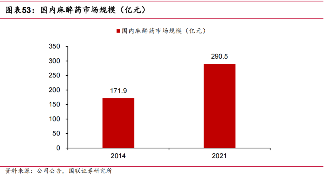 2014-2021年期间,全国麻醉药市场规模由171.9亿元增长至290.5亿元,CAGR达7.78%。在人口老龄化背景下,随着我国经济不断发展,医改政策的持续推进,麻醉药在癌痛止痛等技术领域的应用逐渐推广,麻醉药市将持续释放增长动力,有望迎来快速发展。