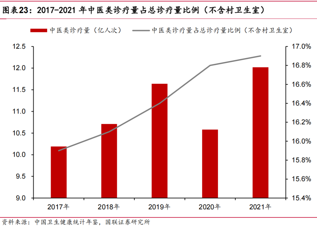 临床终端中医诊疗人次逐年增加,从2017年10.19亿人次增加到2021年12.02亿人次,国内中医类诊疗率从2017年15.9%提升到16.9%,中医药渗透率逐年稳步提升。