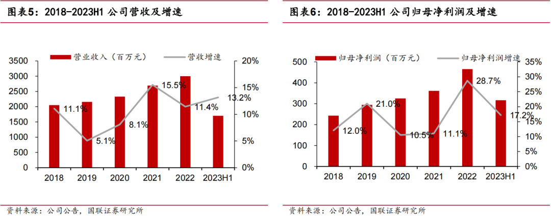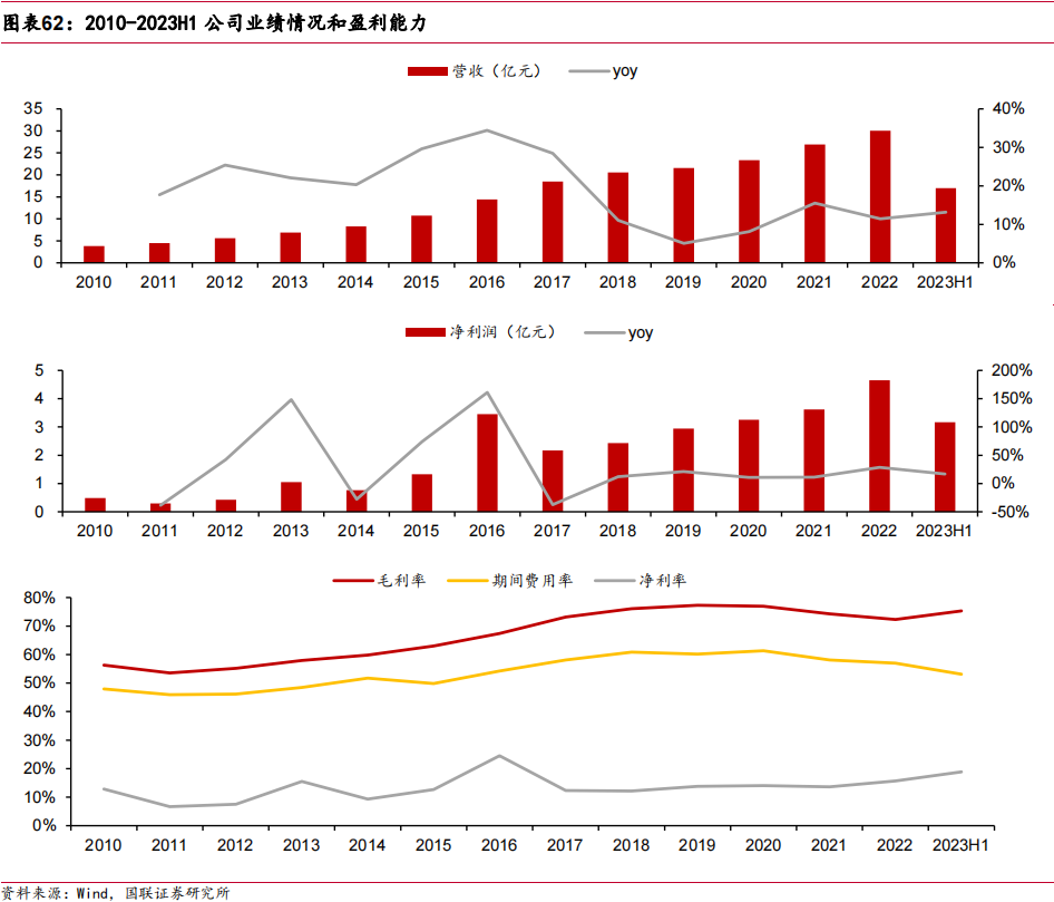 公司业绩稳定增长。2022年公司营收30.02亿元,同比增长11.4%,2018-2022年CAGR达10%。2022年公司归母净利润4.65亿元,同比增长28.7%,增速较收入增速快,主要由于非经常损益高于2021年,2018-2022年CAGR达18%。整体来看,除2019-2020年外,公司过去五年收入增速稳定在10%-15%区间,2019年收入增速减缓预计是由于公司当年刚开始启动营销改革,整合营销团队资源所致,同时费用率下降使得公司利润增速高于收入增速。
