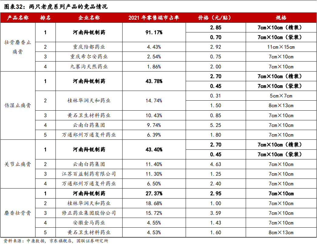据中康数据,2021年子品牌“两只老虎系列”四个产品在同类产品中的市场占有率均为单产品第一,壮骨麝香止痛膏、伤湿止痛膏、关节止痛膏、麝香壮骨膏的市场占有率分别为91.17%、43.78%、43.40%、27.37%,2022年市场占有率分别为92.59%、48.36%、39.28%、30.68%,稳居龙头的位置之余,市占率有所提升。