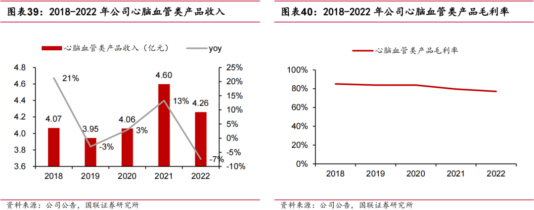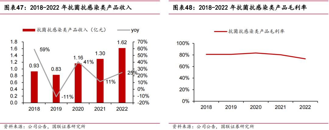2018年公司收购子公司羚锐生物药业少数股权,将其软膏等产品纳入公司营销体系,软膏剂产品实现了较快增长。2022年公司抗菌抗感染类产品收入1.62亿元,同比增长25%,2017-2022年CAGR达23%,快速增长。毛利率在80%左右。