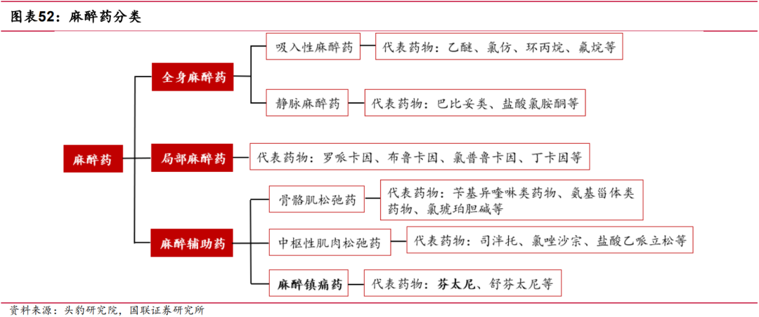 麻醉药指能使整个机体或局部机体暂时可逆性地失去知觉及痛觉的药物。麻醉药兼具麻醉、镇痛、镇静的作用,在临床上常用于手术治疗。根据作用机理不同,麻醉药可分为全身麻醉药、局部麻醉药、麻醉辅助药三类。全身麻醉药作用于中枢神经,使其受到可逆性抑制,从而丧失意识,感觉和发射功能。麻醉辅助药包括肌肉松弛药和麻醉镇痛药,肌肉松弛药包括骨骼肌松弛药和中枢性肌肉松弛药,主要用于松弛骨骼肌,无麻醉、镇静、镇痛作用;麻醉镇痛药通过刺激中枢神经系统特点部位的阿片受体,达到镇痛效果。