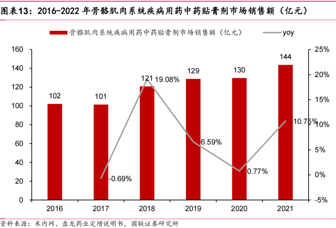 2021年中国骨骼肌肉系统疾病中药市场规模为336亿元,参考2021年中国城市实体药店骨科中成药剂型中,贴膏剂占比为38.22%,测算得出2021年中国骨骼肌肉系统疾病中药贴膏剂市场规模约为144亿元,同比增长10.75%,2016-2021年CAGR为7.06%。