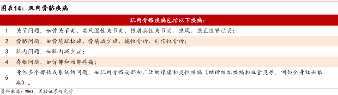 根据WHO,肌肉骨骼疾病包括150多种影响个人运动系统的疾患,其涵盖范围从突然出现的短暂问题(如骨折、扭伤和拉伤),到功能持续受限和残疾等终身疾患。肌肉骨骼疾病的典型特征是疼痛(通常是持续疼痛)以及行动能力、灵巧性和总体功能受限,工作能力降低。