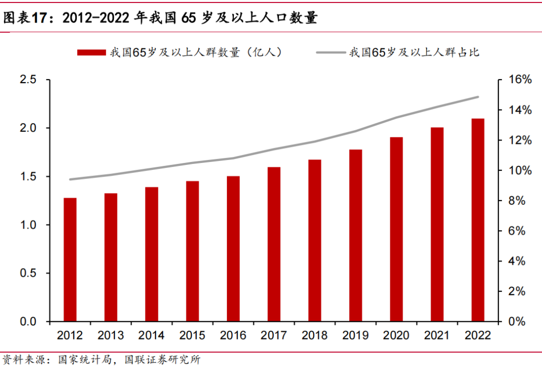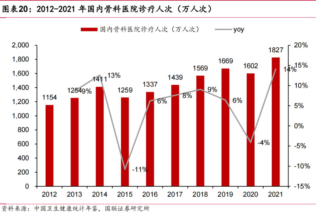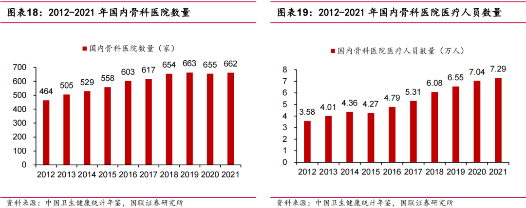 国家统计局数据显示,我国65岁及以上人口数量逐年提升,2022年达2.1亿人次,占比从2012年10%提升到2022年15%,我国老龄化加速,骨科患者人数将持续扩容。