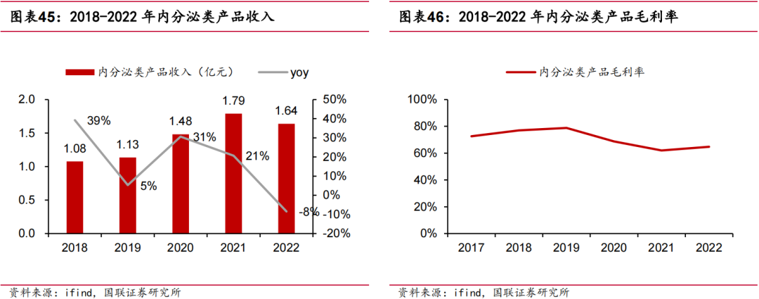 2022年内分泌类产品收入达1.64亿元,2017-2022年CAGR达16%。我们认为,2020-2021年毛利率有所下滑预计主要由于原材料价格上涨。