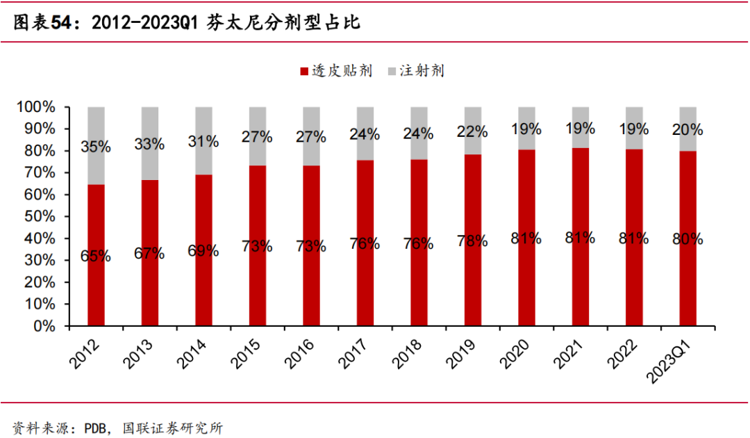 芬太尼分为注射剂和透皮贴剂两种剂型,透皮贴剂相比注射剂,使用方法简便,不良反应较低,止痛效果好,广泛用于癌性疼痛和非癌性疼痛的治疗,2012年以来透皮贴剂的占比逐步提升,目前占比为80%左右。