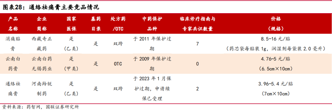 公司的通络祛痛膏为独家产品,主要功效为活血通络,散寒除湿、消肿止痛,主要竞品为市场份额分别排名第一、二的消痛贴膏、云南白药膏,三者均纳入国家医保目录和国家基药目录。相比之下,消痛贴膏和通络祛痛膏的循证医学证据更为充分,且通络祛痛膏具备价格优势。