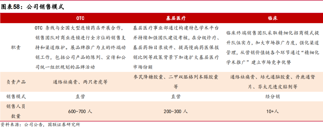 第一次营销改革:2012-2018年期间,公司成立各大事业部,逐步拓展产品管线的布局和销售渠道的覆盖,探索合适的营销模式,加大销售费用的投入。形成了自建销售队伍、招商代理推广模式,开展产品推广活动,以实现对医疗机构终端、零售终端的覆盖。组建了专业的营销团队,以大区经理、地区经理和终端代表三级销售队伍管理模式。