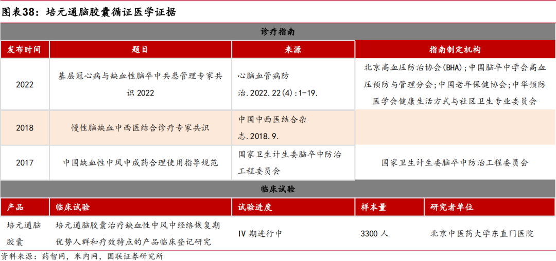 培元通脑胶囊作为缺血性中风中经络恢复期治疗用药,2017年以来被纳入诊疗指南和专家共识,目前公司正开展3300人样本量的IV期临床研究,循证医学证据逐步完善。