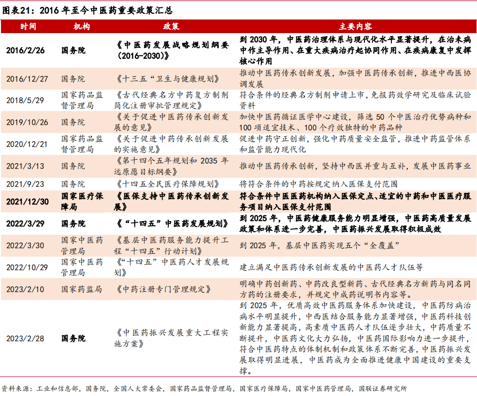 顶层战略持续利好,并指引中医药发展方向。2016年至今,中医药政策不断出台,坚持继承和创新并重,推进中医药现代化,助力产业升级,在审评审批端、医保支付端上给予更多的利好,并明确中医药的发展定位:在治未病中作主导作用、在重大疾病治疗起协同作用、在疾病康复中发挥核心作用。