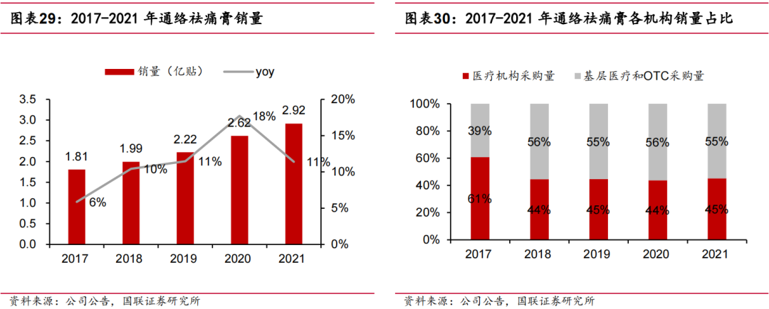 2017-2021年公司通络祛痛膏销量CAGR为12.72%,呈现稳定增长的态势。其中医疗机构采购量占比稳定在45%。根据公司公告,预计2022年通络祛痛膏销售额已达10亿量级。
