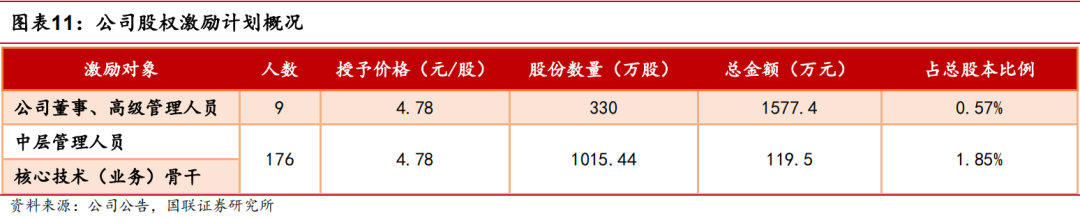 公司于2021年推出了股权激励计划,拟向185名激励对象授予限制性股票共1381万股,约占公司总股本的2.43%。激励对象包括公司董事及高级管理人员、中层管理人员、核心技术(业务骨干),通过股权激励提高骨干员工的积极性,从而推动公司进一步发展。