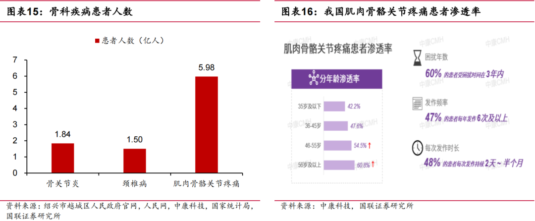 我国骨科疾病患者基数大,发病率随着年龄的增长而提升。根据2022年绍兴市越城区人民政府官网报道,我国骨关节炎患病率约13%,患者人数约1.84亿人, 65岁以上人群患病率达50%;根据2019年人民网报道,颈椎病患者达1.5亿人;根据2022年中康科技公布,肌肉骨骼关节疼痛患者更是高达5.98亿人,其中56岁及以上人群患病率高达60.8%,肌肉骨骼关节疼痛发作频率较高、持续时间长,近五成患者每年发作6次及以上,且每次发作持续近半个月,极大程度影响生活和工作。