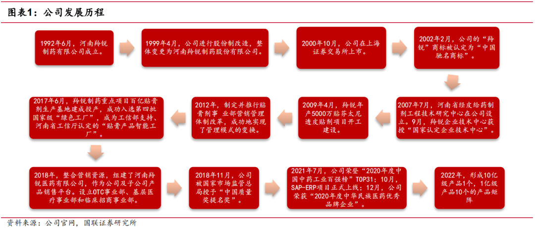 羚锐制药为骨科中药贴膏剂龙头企业。公司拥有百余种产品,聚焦骨科疾病、心脑血管疾病等中医药治疗优势领域,核心产品为通络祛痛膏、两只老虎系列等骨科中药贴膏剂,培元通脑胶囊等针对慢性病的品种。1992年公司成立;2000年在上交所挂牌上市;2002年公司的“羚锐”商标被认定为“中国驰名商标”;2012年开启第一轮营销改革,收入加速增长,2018年开启第二轮营销改革,盈利能力逐步提升;目前公司已形成销售额10亿级产品1个,1亿级产品10个的产品矩阵。
