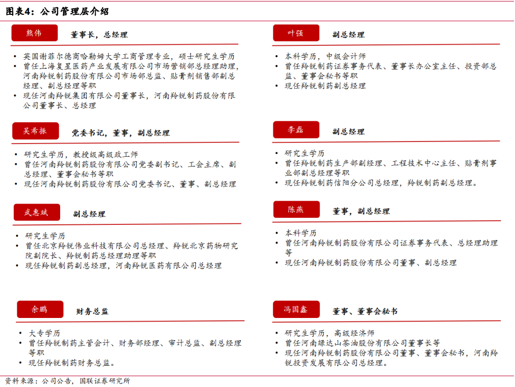 实控人年轻有为,管理层从业经验丰富。现任董事长熊伟先生出生于1984年,英国谢菲尔德哈兰姆大学国际市场营销专业硕士毕业,曾任上海复星医药产业发展有限公司市场营销部总经理助理,随后进入羚锐制药历任市场部总监,贴膏剂销售部副总经理、羚锐制药副总经理等职务,2019年4月接任羚锐集团董事长和法定代表人(原为其父亲熊维政先生),亲历前线工作直到管理层工作,对公司及行业有着深刻的认识。此外,公司大多数管理层在公司或子公司工作多年,均有着丰富从业经验,管理层对公司业务熟悉是公司能够长期稳定发展的基础。