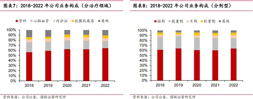 公司主要收入来源于骨科产品。分治疗领域来看,公司骨科产品占比最高,2022年达64%,并且逐年提升;其次是心脑血管和内分泌科等慢性病治疗领域。分剂型来看,主要的收入来源于贴剂和胶囊剂,片剂占比逐年提升。