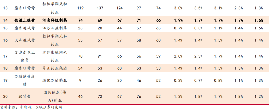 2021年9月公司对袋装产品进行了提价,其中壮骨麝香止痛膏、伤湿止痛膏、关节止痛膏分别提价0.1、0.05、0.1元/贴。以市占率排名较前的竞品来看,公司袋装产品仍有价格优势,未来仍有提价空间。