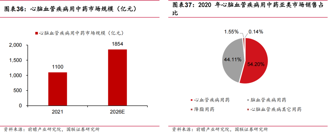 2021年心脑血管疾病用中药市场规模达1100亿元,预计增长至2026年1854亿元,2021-2026年CAGR达11.01%。其中,2020年脑血管疾病用中药占比44.11%。