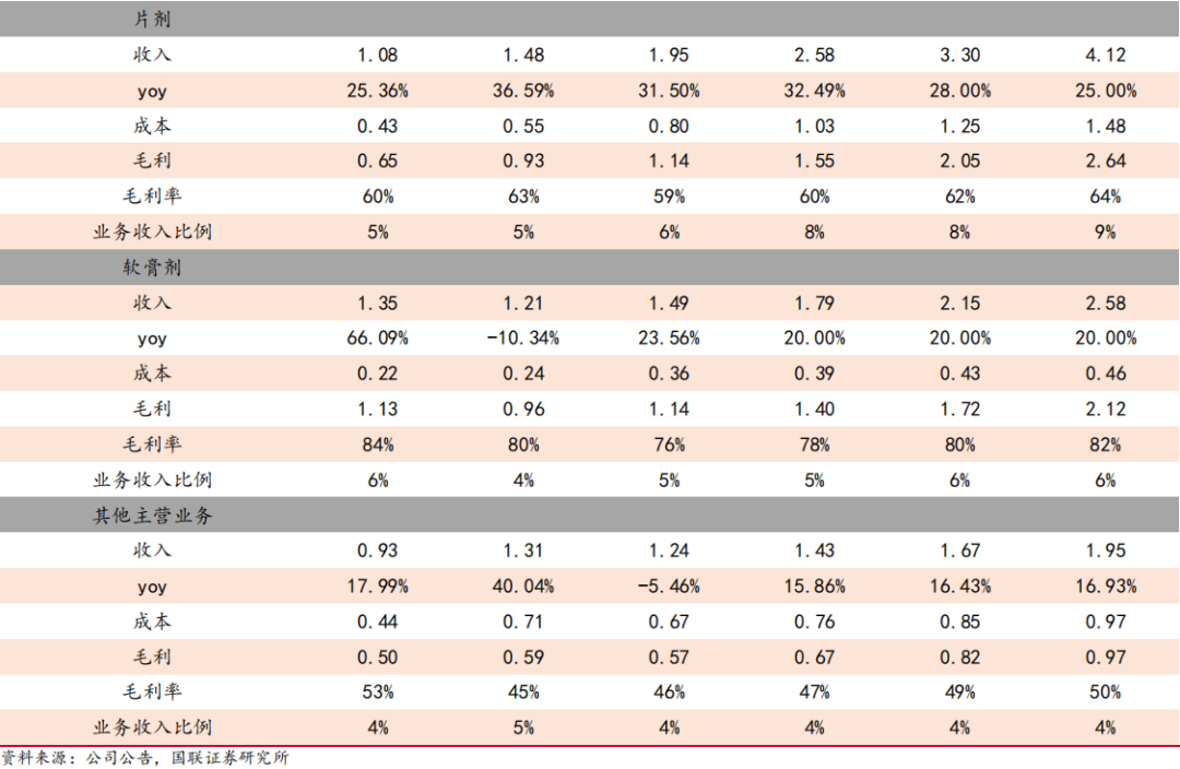 片剂:公司在骨科贴剂的品牌和渠道优势有望加持丹鹿通督片的销售,随着公司改善院端的销售模式,院端产品增长动力逐步释放,有望保持快速增长趋势。随着原材料成本管控,信息化等改造提升经营效率,叠加规模效应显现,预计毛利率有所提升。预计2023-2025年收入分别为2.58/3.30/4.12/亿元,同比增长分别为32%/28%/25%,毛利率分别为60%/62%/64%。