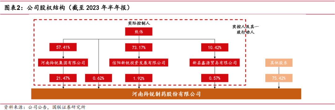 股权结构相对集中。截至2023H1,实控人熊伟先生直接和间接控制公司股份24.58%。其中,熊伟先生直接持有公司股份0.62%;分别控制羚锐集团、新锐投资、鑫源贸易57.41%、73.17%、10.42%股权,并通过上述主体间接控制公司股份合计23.96%。