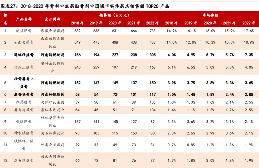 公司骨科中成药贴膏剂市占率逐年提升,2022年排名第二。根据米内网中国城市实体药店销售额数据,2022年骨科中成药贴膏剂前十市场份额占比55.4%,竞争格局相对集中。其中,公司通络祛痛膏、壮骨麝香止痛膏、麝香壮骨膏、伤湿止痛膏分别排名第3、5、6、14,占市场份额分别为7.3%、3.6%、2.8%、1.6%,四款产品合计市场份额从2018年11.3%逐年提升至2022年15.3%,仅次于奇正藏药。