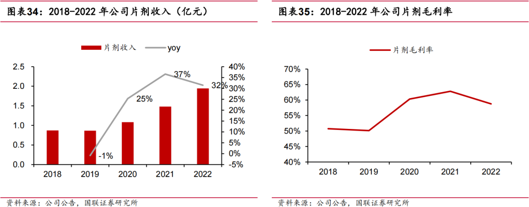 公司在骨科贴剂的品牌和渠道优势有望加持丹鹿通督片的销售,随着公司改善院端的销售模式,院端产品增长动力逐步释放,2022年公司片剂产品收入达1.95亿元,同比增长32%,2018-2022年CAGR达22%,呈现快速增长的趋势。毛利率也有所提升,从2018年的50.75%提升至58.77%。