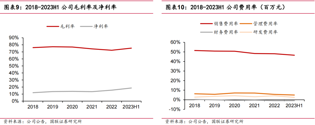 公司毛利率稳定在75%上下。公司于2018年整合营销资源,将各大事业部的销售团队整合到子公司河南羚锐医药有限公司,作为公司产品的统一销售平台。叠加公司致力于智能化、信息化、自动化等改造,提高了公司的生产、管理、销售效率,公司费用率有所下降,净利率逐年提升。