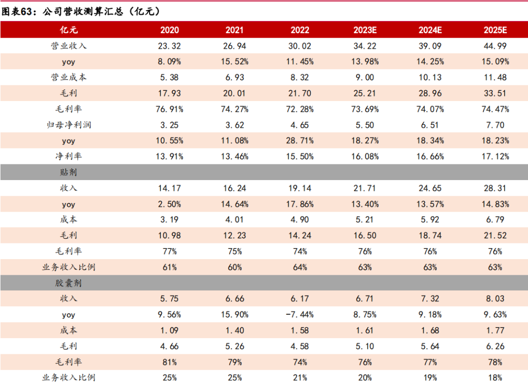 贴剂:随着老龄化趋势加剧,通络祛痛膏有望维持稳定增长;两只老虎系列贴膏剂自提价之后销量处于修复期,明年有望恢复增长,产品仍有提价空间;儿科贴剂受益于小羚羊品牌力的提升以及今年上半年流感的高发,快速增长;芬太尼贴剂近年市占率逐步提升,有望保持快速增长趋势。预计2023-2025年收入分别为21.71/24.65/28.31/亿元,同比增长分别为13.40%/13.57%/14.83%,毛利率分别为76%/76%/76%。