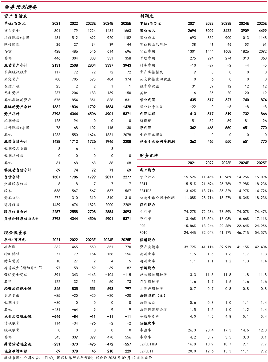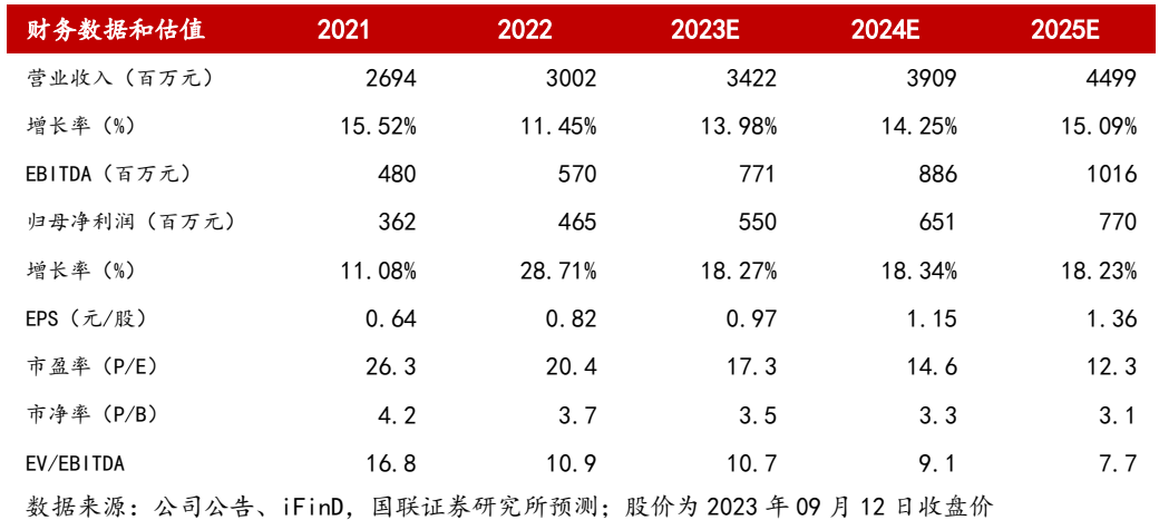 综上所述,我们预计公司2023-2025年营收分别为34.22/39.09/44.99亿元,同比增速分别13.98%/14.25%/15.09%,营收三年CAGR为14.44%,归母净利润分别为5.50/6.51/7.70亿元,同比增速分别为18.27%/18.34%/18.23%,归母净利润三年CAGR为18.28%。