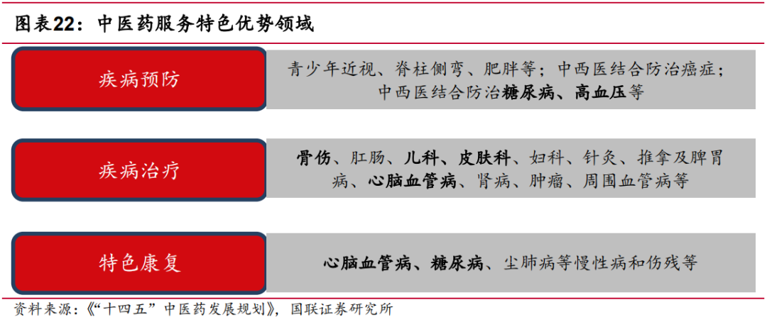 《“十四五”中医药发展规划》中提出持续提升中医药健康服务能力,并明确中医药在预防、治疗与康复中的特色优势领域,其多对应现代高发疾病,其中包括骨科、心脑血管、糖尿病等领域。