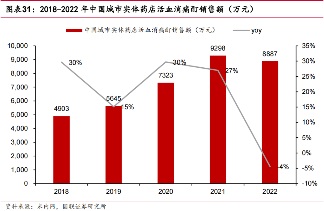 活血消痛酊主要功效为活血化瘀,散寒通络,祛风除湿,舒筋止痛,成分与通络祛痛膏一致。公司打造“通络+活血”产品组合,推广先搽后贴的联合用药,从而带动活血消痛酊的销量增长。2022年公司的活血消痛酊销售额达亿元。根据中康数据,2018-2022年活血消痛酊中国城市实体药店销售额CAGR达16%,呈现快速增长趋势。