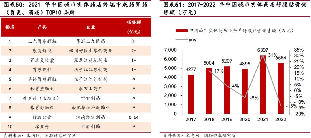 2021年中国城市实体药店终端中成药胃药市场规模约27亿元,同比增长7.24%。公司的小羚羊舒腹贴膏主要用于胃脘痛、腹痛腹胀、恶心、呕吐、食欲不振、肠鸣腹泻、小儿泄泻。在2021年中国城市实体药店终端中成药胃药TOP10品牌中,公司的小羚羊舒腹贴膏排名第九。在舒腹贴膏产品中,公司市占率高达92.69%。2022年公司在中国城市实体药店销售额为5564万元,2017-2022年CAGR为5.4%。未来随着公司品牌力的提升,有望稳定增长。